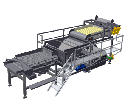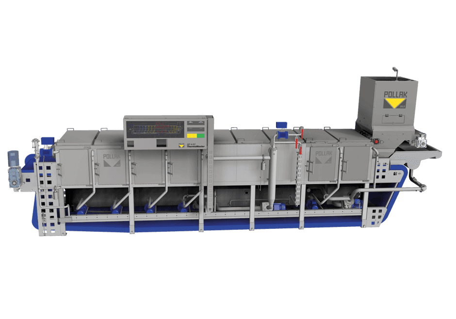 Blancher-cooler with multistage water circulation for thermal treatment and cooling of various products such as green peas, sweet corn, green beans, cauliflower, broccoli, pepper, and spinach.
